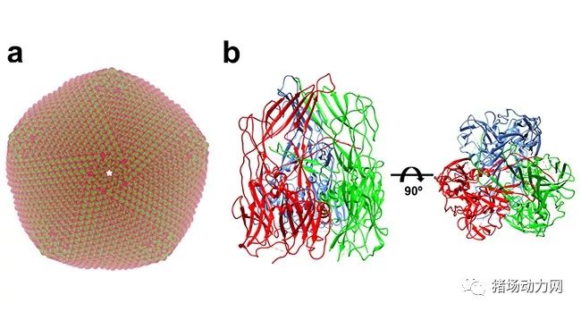 非洲猪瘟病毒结构:a. 依据非洲猪瘟病毒衣壳蛋白p72结构模拟病毒组装产生的非洲猪瘟病毒衣壳结构;b. 非洲猪瘟病毒衣壳蛋白p72三聚体冷冻电镜结构。非洲猪瘟病毒是一种双链DNA病毒,拥有复杂的结构,它的基因组由两层衣壳和两层外膜保护,衣壳主要由病毒编码蛋白p72构成,据以往试验数据估计,p72占病毒颗粒总重33%左右,同时p72是被病毒感染猪血液中能检测到的主要抗原。